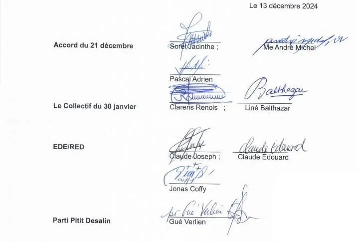Actualité à la une du 14 décembre 2024 Les parties prenantes, signataires de l’Accord du 21 décembre, le Collectif du 30 janvier, EDE/RED et Pitit Dessalines, expriment leurs vives préoccupations face à la détérioration de la situation socio-politique en Haïti. Elles dénoncent les décisions unilatérales des neuf « Conseillers-Présidents », sous la direction de leur Coordonnateur Leslie Voltaire.