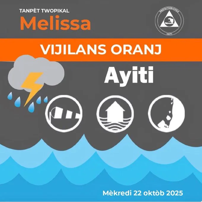 Tempête tropicale Melissa : Le grand Sud et l’Ouest sont passés de vigilance jaune à vigilance orange en raison des risques accrus d’inondations et de glissements de terrains, a annoncé l’Unité Hydrométéorologique d’Haïti (UHM).