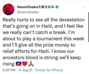 Naomi Osaka a exprimé sa tristesse sur twitter suite au passage dévastateur du tremblement de terre dans le Sud d’Haïti. Elle croit que les Haïtiens se relèveront, soulignant ”le sang de nos ancêtres est fort”.