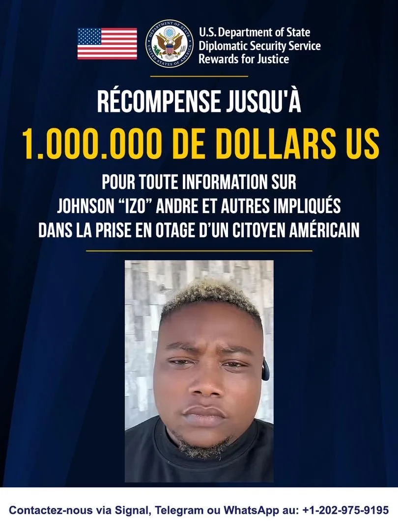 Les Etats-Unis encouragent toute personne disposant des informations concernant Johnson « Izo » André à contacter le programme Rewards for Justice via Signal, Whatsapp ou Telegram au +1-202-702-7843. Toutes les informations communiquées seront traitées de manière strictement confidentielle.